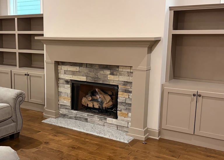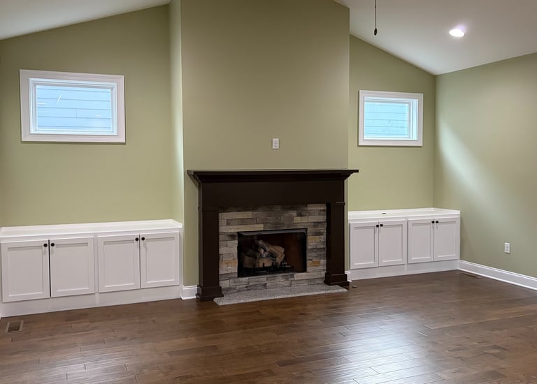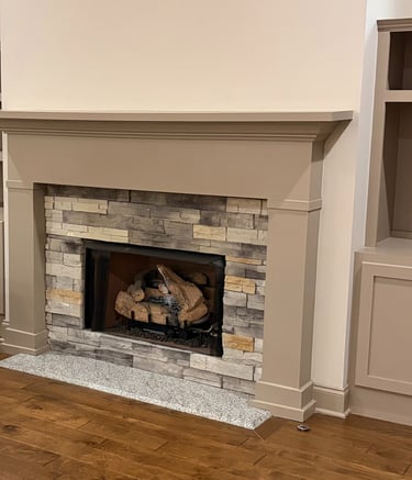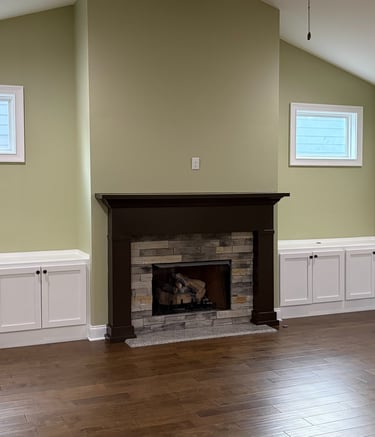 We removed the dark built-in shelves, painted the cabinets white, the walls sage green, and the mantle brown.